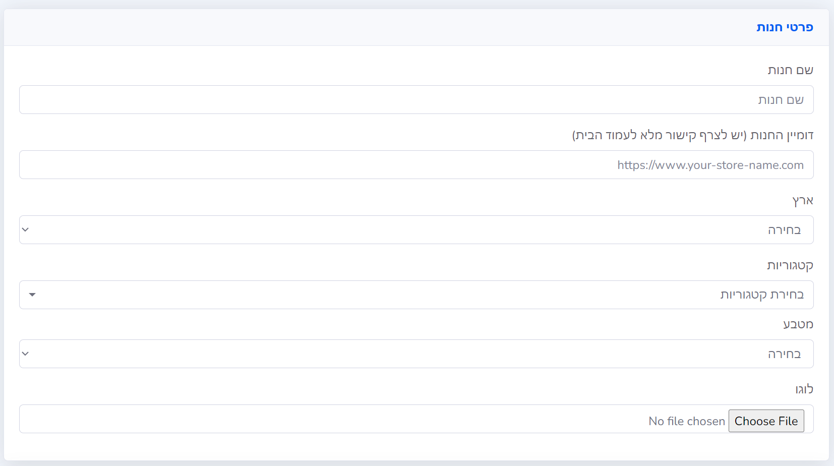 | ארץ | בחרו בישראל אם החנות שלכם ממוקמת בישראל ופונה לקהל הישראלי |