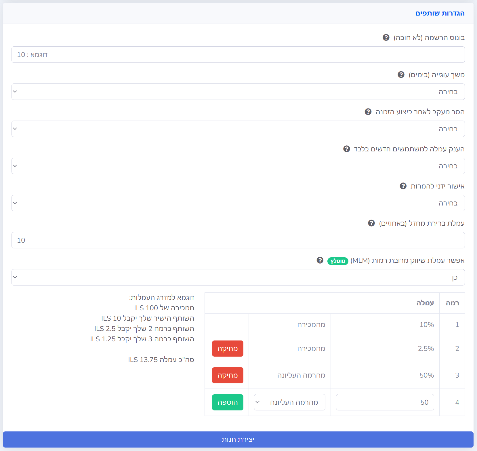 | אפשר עמלת שיווק מרובת רמות (MLM) | על מנת לתמרץ שותפים להגדיל את רשת השותפים ניתן להעניק עמלה אל השותפים שהזמינו שותפים חדשים עד ל-10 רמות בסה"כ. ניתן להגיד עמלה באחוזים הנגזרת משווי המכירה או שווי העמלה של השותף ברמה הקודמת. |
